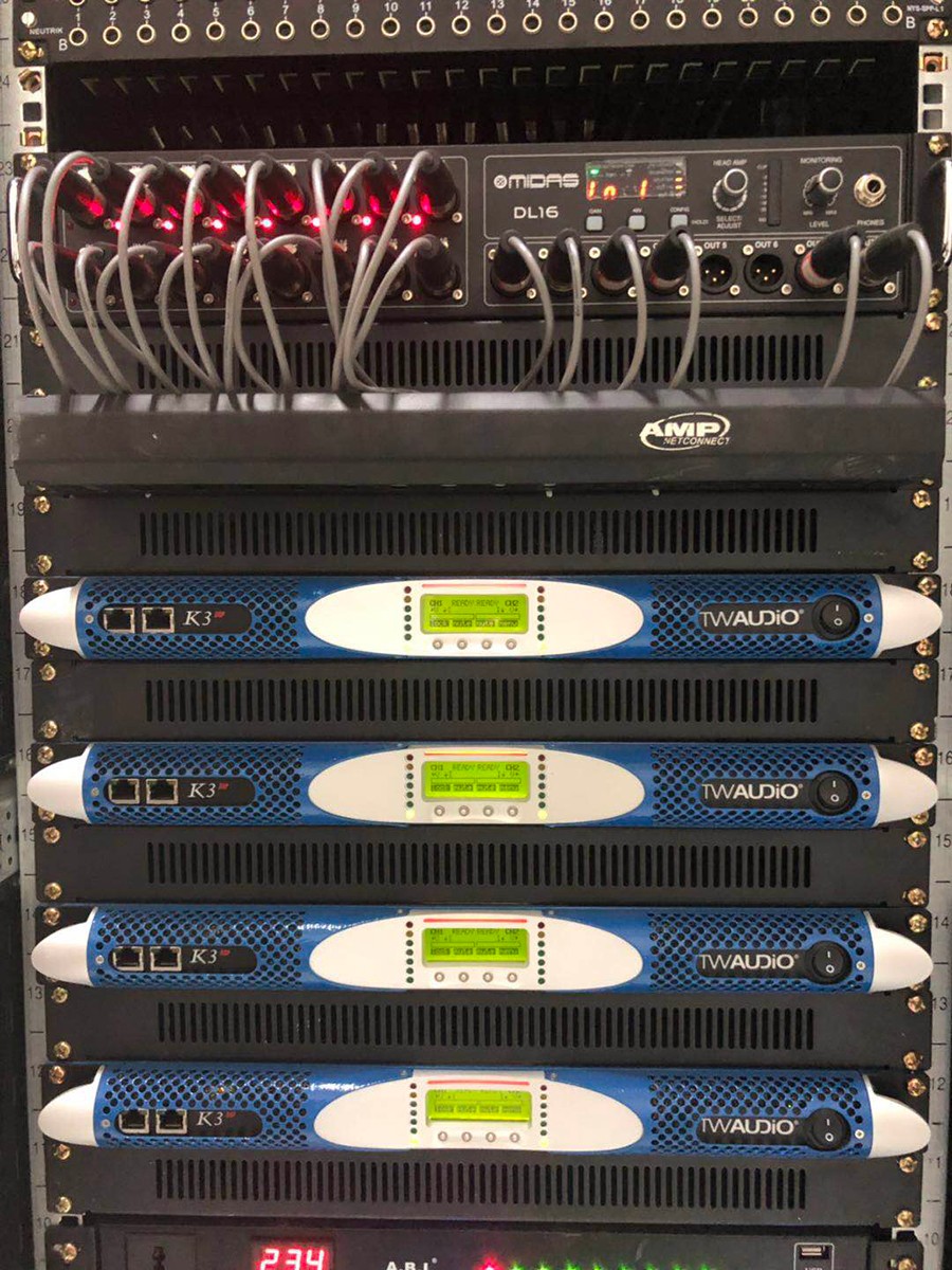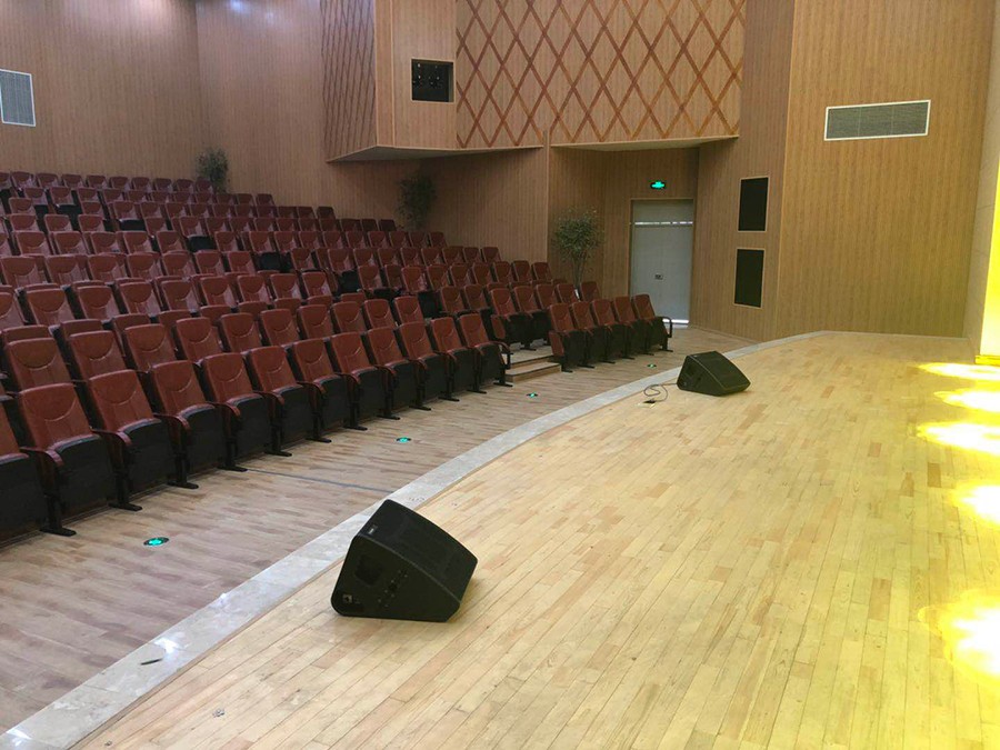 電子科技大學(xué)實驗中學(xué)劇場主擴聲系統(tǒng)采用6只90°的T20點聲源線陣列揚聲器打造,2只為一組分別吊掛在舞臺兩側(cè)和舞臺中央作為主擴聲,2只M12全頻音箱搭配2只B30超低放置在舞臺兩側(cè)作為前補聲以及低音補充,除此之外還有C12作為舞臺監(jiān)聽。整套系統(tǒng)由4臺K3DSP數(shù)字功放驅(qū)動。監(jiān)控室內(nèi)采用英國Midas M32數(shù)字調(diào)音臺以及DL16舞臺接口箱。
